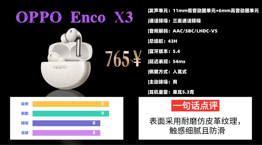 音质采用双动圈架构,11mm单元负责低频、6mm单元负责高频,配合独立双DAC解码,声音密度与层次感表现不错,低频厚实有弹性,人声干净通透,高频明亮不刺耳。支持LHDC 5.0与空间音频,现场感与包围感更强。蓝牙5.3连接稳定,游戏低延迟至54ms,单次续航6.5小时,综合续航可达43小时。