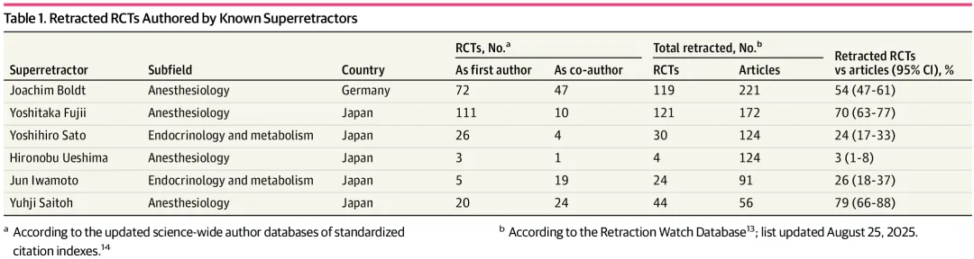 如果有人告诉你,全世界每4篇被撤稿的随机对照试验(RCT)中,就有1篇与不到20个人有关,你大概会觉得这是耸人听闻。2026年4月15日,JAMA Network Open发表一项系统性研究,首次用数据为这一灰色地带画了张清晰的肖像:那些撤稿数量惊人、却长期逍遥于学术体系内的“超级撤稿者”(Superretractors),到底是谁,有多少人,造成了多大破坏。结论令人震惊:在全球1330篇被撤稿的RCT中,仅仅6个人就“贡献”了290篇,占总数的22%。他们集中在2个临床专科,有5人来自日本,涉假文章平均在文献中流通14年才被撤回,持续污染着系统综述、临床指南和真实患者的治疗决策。用该研究配套评论的话来说,这些人是证据生态系统中的“超级传播者”。这项研究由意大利帕多瓦大学、法国雷恩大学以及美国斯坦福大学的学者联合完成。合著者中包括斯坦福大学教授约翰·约安尼迪斯(John P.A. Ioannidis)——他是全球最知名的“学术泡沫刺穿者”之一,其代表作《为什么大多数已发表的研究发现都是错的》曾引发学界地震。研究团队以VITALITY队列为基础,这是一个收录了截至2024年11月全球1330篇被撤稿RCT的公开数据库。团队将其与“撤稿观察”(Retraction Watch)推出的“论文撤稿排行榜”前30名、职业生涯引用量居全球前列且累计撤稿超10篇的163名高被引学者名单,以及2024年度被引用量靠前的174名学者名单,进行交叉比对。在“论文撤稿排行榜”前30人中,6人累计共著290篇RCT被撤稿,占全部1330篇撤稿总数的22%。而在163位高被引学者中,18人共著327篇撤稿RCT,占总数的25%。据该研究披露,6位“超级撤稿者”均集中在两个临床专科:4人来自麻醉学科,2人来自内分泌代谢专业。按国籍划分,日本包揽5席,剩余1名是德国学者。其中,日本麻醉科医生藤井善隆(Yoshitaka Fujii)总撤稿172篇,RCT占比70%。他的数据曾被同行质疑“完美”到不切实际,2012年被查实大规模造假。德国麻醉学者阿希姆·博尔特(Joachim Boldt)总撤稿221篇,RCT占比54%,以总撤稿数居所有“超级撤稿者”之首。日本麻醉学者齐藤裕司(Yuhji Saitoh)虽然总撤稿数较少(56篇),但其中RCT占比高达79%,是所有人中最高的。从时间维度看,这些“超级撤稿者”的被撤RCT从发表到撤回,时间中位数为5111天,约14年。在这14年里,假论文以正常学术文献的身份流通于世,被引用,被纳入系统综述,留存在整体证据链中。表:知名“造假之王”们撰写的被撤稿RCT概况。/表源:JAMA Network Open