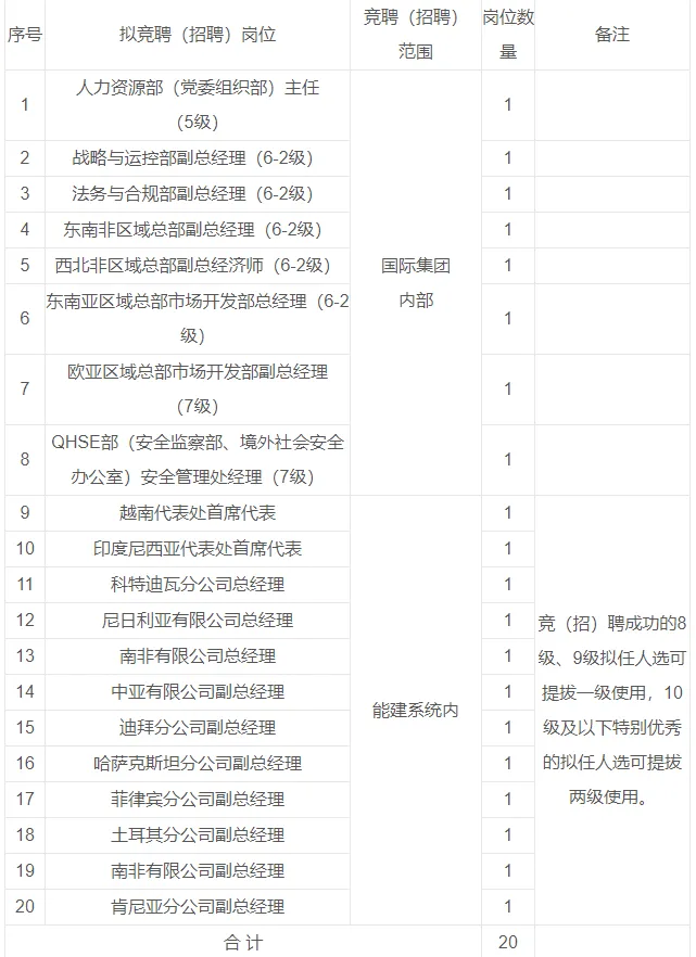 中能建国际建设集团有限公司(简称:中国能建国际集团)作为中国能建海外业务核心平台,为加强公司职能部门、区域总部、海外分支机构人才梯队建设,加快年轻干部储备,优化人力资源结构,充分激发干部员工队伍干事创业活力,拟面向具有培养潜力和干事创业冲劲的年轻人才选拔一批关键核心岗位管理人员,为国际业务高质量发展提供坚强的组织保障。经公司研究,决定开展职能部门、区域总部、海外分支机构等相关岗位竞聘(招聘)工作。具体公告如下: