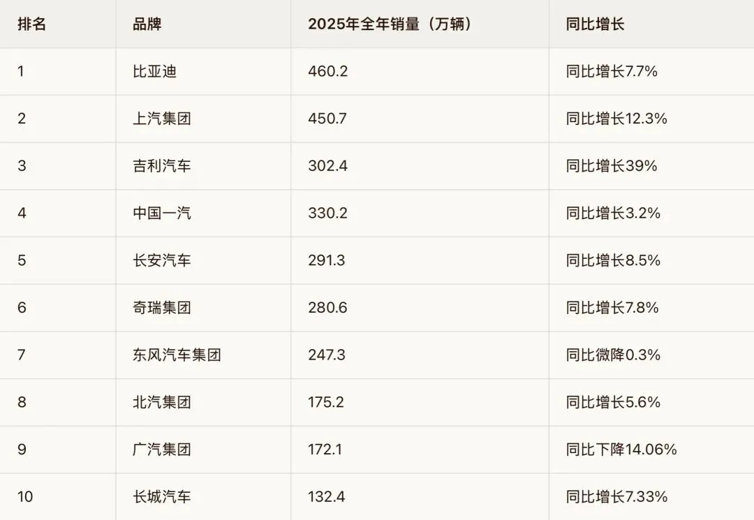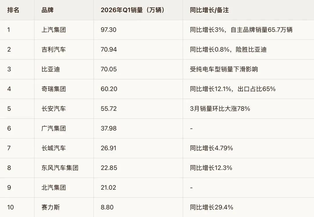 1. 格局变化:2026年第一季度上汽集团重夺销量冠军,吉利与比亚迪竞争激烈。