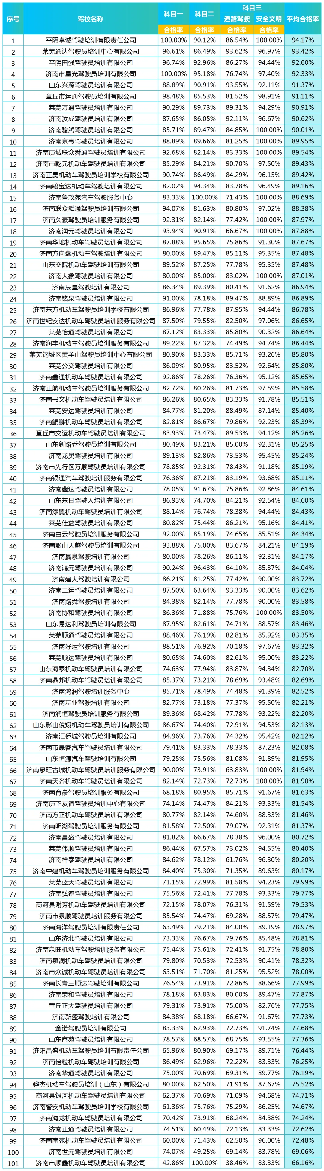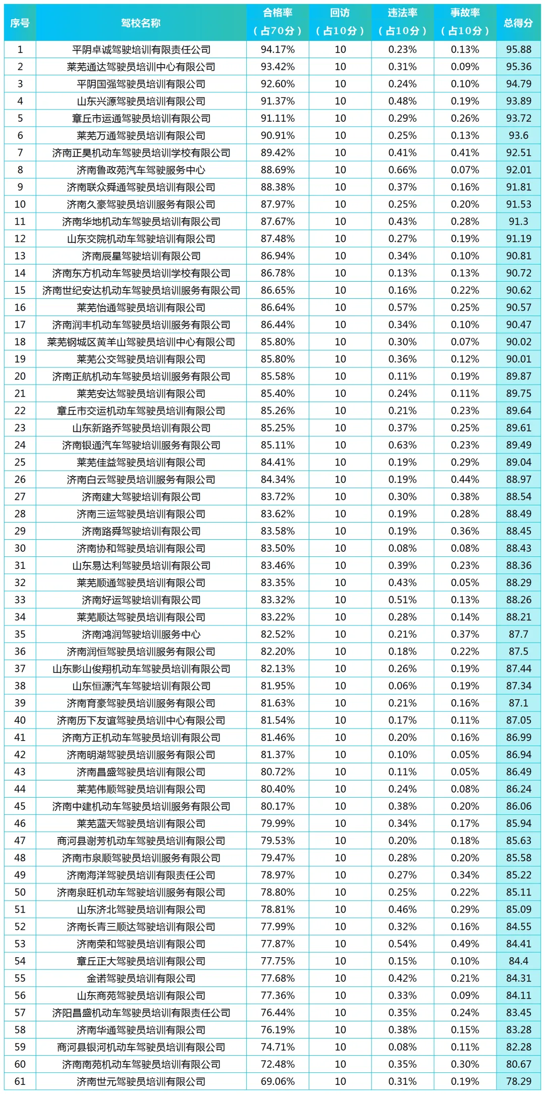 1、数据来源于车管所相关业务科室和《济南市公安局交通管理支队大数据业务支持系统》。2.因济南市星光驾驶员培训有限公司、济南骏腾驾驶员培训有限公司、济南新盛驾驶培训有限公司、济南大象驾驶员培训有限公司、济南鲲鹏机动车驾驶员培训有限公司、济南方向盘机动车驾驶培训有限公司、济南市乾元机动车驾驶员培训有限公司、济南添翼机动车驾驶员培训有限公司、山东东日驾驶人培训有限公司、济南龙奥驾驶员培训有限公司、济南骏宝达机动车驾驶培训有限公司、济南书文机动车驾驶员培训有限公司、济南鑫达驾驶员培训有限公司、济南鼎邦机动车驾驶员培训有限公司、济南泉旺古城机动车驾驶员培训服务有限公司、济南鸿元驾驶员培训有限公司、济南倍粒机动车驾驶培训有限公司、济南鑫通机动车驾驶员培训有限公司、济南赢泉驾驶培训有限公司、济南影山天麒驾驶员培训有限公司、骅杰机动车驾驶员培训(山东)有限公司、济南基业驾驶培训有限公司、济南天齐机动车驾驶员培训有限公司、济南市晟睿汽车驾驶员培训有限公司、济南市先行区万顺驾驶员培训有限公司、济南海龙机动车驾驶员培训有限公司、济南汇侨城驾驶员培训有限公司、济南警安机动车驾驶员培训学校有限公司、济南泉润机动车驾驶员培训有限公司、山东海泰机动车驾驶员培训有限公司、济南市众诚机动车驾驶员培训有限公司、济南市顺鑫机动车驾驶员培训有限公司、山东启尧机动车驾驶员培训有限公司《济南市公安局交通管理支队大数据业务支持系统》或考试科发送的合格率无数据暂不排名。