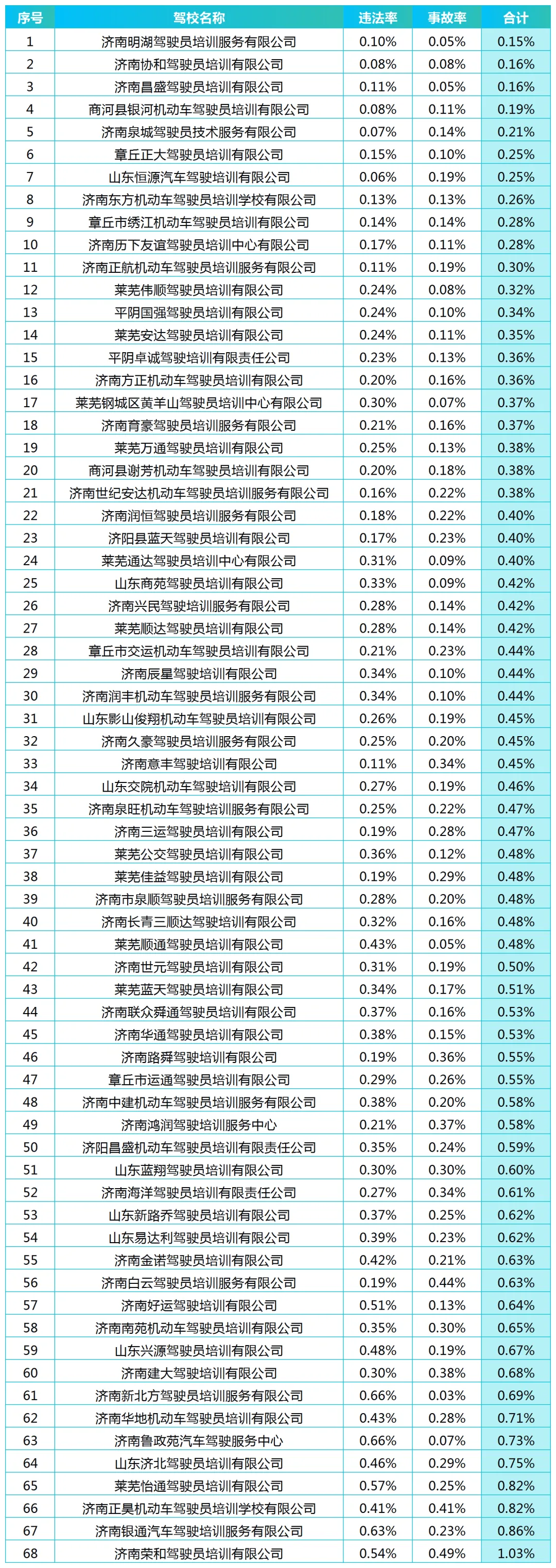 济南龙奥驾驶员培训有限公司、济南市乾元机动车驾驶员培训有限公司、济南鲲鹏机动车驾驶员培训有限公司、济南鼎邦机动车驾驶员培训有限公司、济南倍粒机动车驾驶培训有限公司、济南天齐机动车驾驶员培训有限公司、济南骏腾驾驶员培训有限公司、济南市星光驾驶员培训有限公司、济南书文机动车驾驶员培训有限公司、济南影山天麒驾驶员培训有限公司、济南鑫通机动车驾驶员培训有限公司、济南添翼机动车驾驶员培训有限公司、济南市顺鑫机动车驾驶员培训有限公司、骅杰机动车驾驶员培训(山东)有限公司、济南泉旺古城机动车驾驶员培训服务有限公司、济南市先行区万顺驾驶员培训有限公司、济南泉润机动车驾驶员培训有限公司、山东东日驾驶人培训有限公司、济南汇侨城驾驶员培训有限公司、济南赢泉驾驶培训有限公司、山东海泰机动车驾驶员培训有限公司、济南鸿元驾驶员培训有限公司、济南海龙机动车驾驶员培训有限公司、山东启尧机动车驾驶员培训有限公司、济南警安机动车驾驶员培训学校有限公司、济南市众诚机动车驾驶员培训有限公司、济南新盛驾驶培训有限公司、济南骏宝达机动车驾驶培训有限公司、济南方向盘机动车驾驶培训有限公司、济南市晟睿汽车驾驶员培训有限公司、济南大象驾驶员培训有限公司、济南鑫达驾驶员培训有限公司、济南基业驾驶培训有限公司因《济南市公安局交通管理支队大数据业务支持系统》无数据暂不排名。