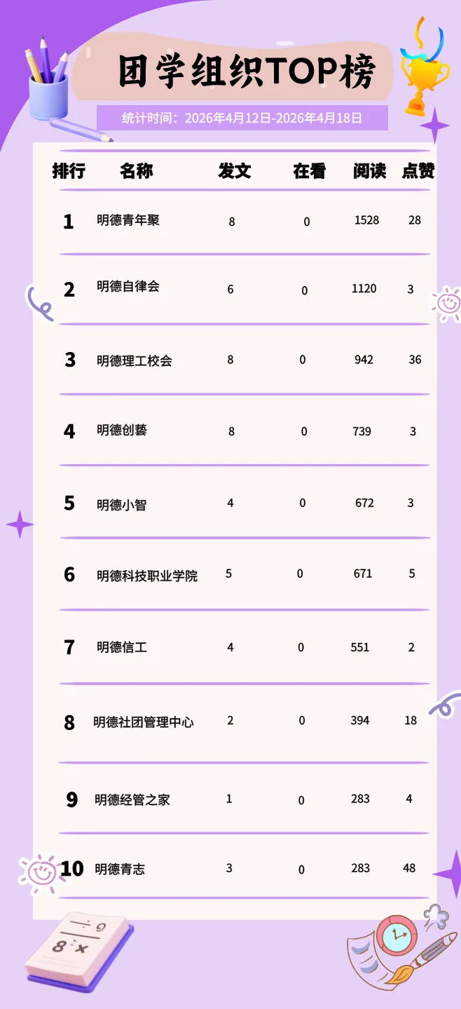 本次冠军宝座由明德明德青年聚获得,阅读量达到1528。明德自律会阅读量达1120,拿到亚军。明德理工校会阅读量达到942,跻身前三甲,夺下季军席位。