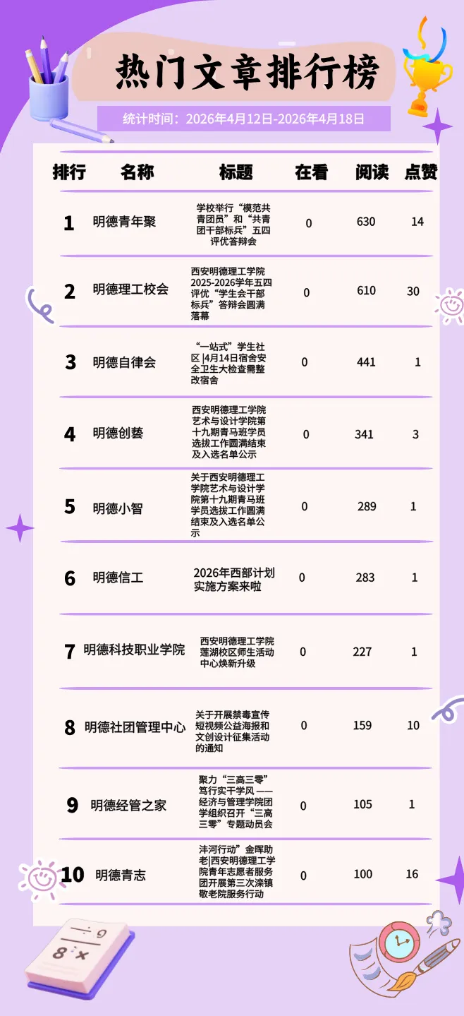 恭喜明德青年聚|学校举行“模范共青团员”和“共青团干部标兵”五四评优答辩会荣获本次排行榜冠军,阅读量达到630。明德理工会|西安明德理工学院2025-2026学年五四评优“学生会干部标兵”答辩会圆满落幕阅读量达到610,拿到亚军。恭喜明德自律会“一站式”学生社区|4月14日宿舍安全卫生大检查需整改宿舍阅读量达到441拿下季军。