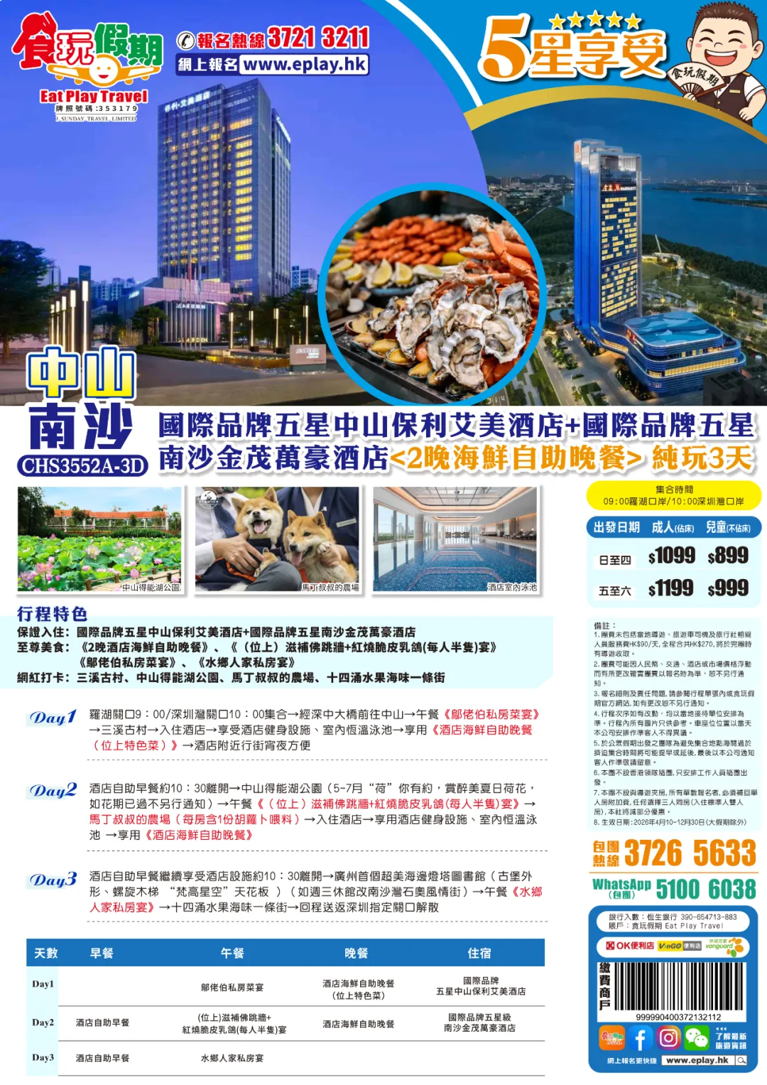 $1099 中山南沙純玩3天團國際品牌五星中山保利艾美酒店+國際五星南沙金茂萬豪酒店<2晚酒店海鮮自助晚餐>