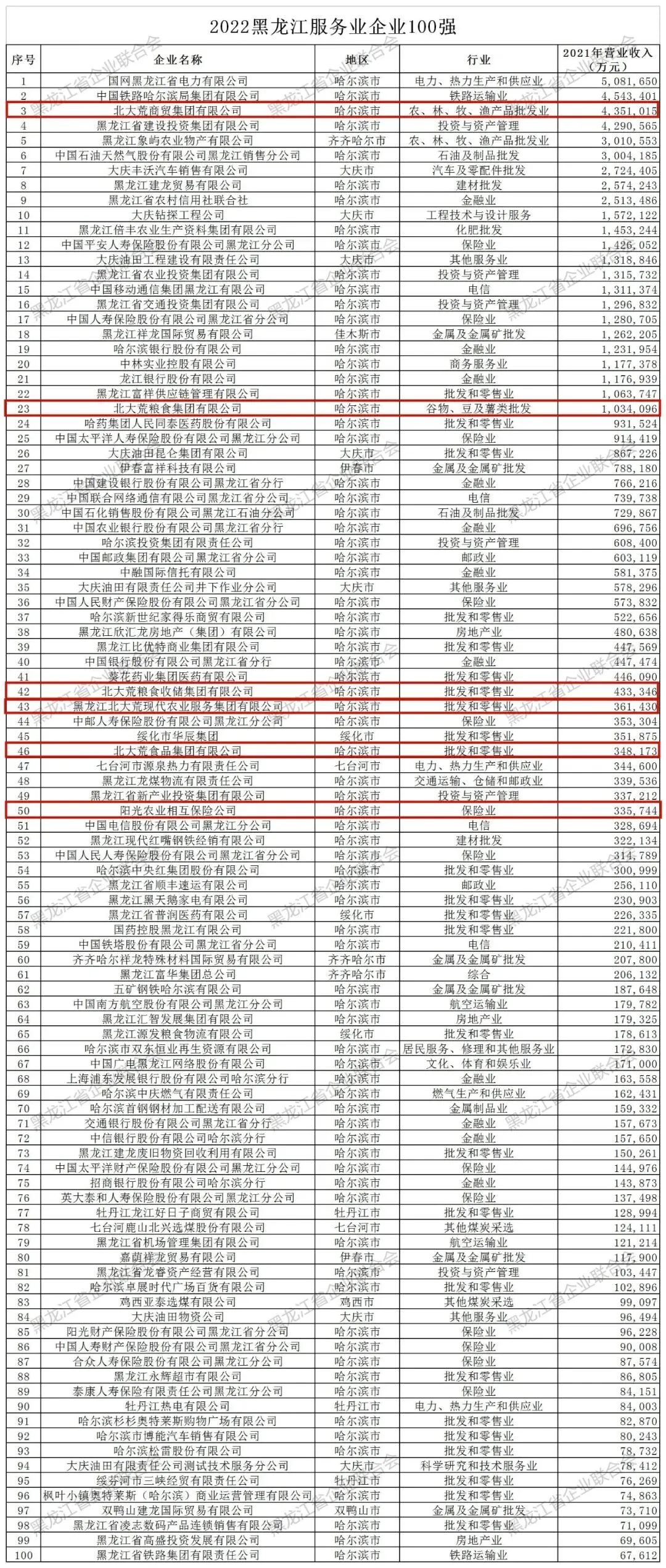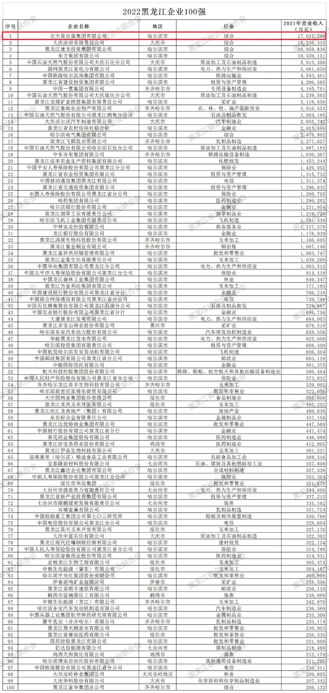 12月12日,黑龙江省企业联合会向社会公开发布了2022黑龙江企业100强、黑龙江制造业企业100强、黑龙江服务业企业100强、黑龙江民营企业100强、黑龙江玉米深加工企业10强五份榜单。北大荒农垦集团有限公司以年营收1703.75亿元位列“2022黑龙江企业100强 ”第一名。九三集团、丰缘集团、完达山等13家企业分列其他榜单。
