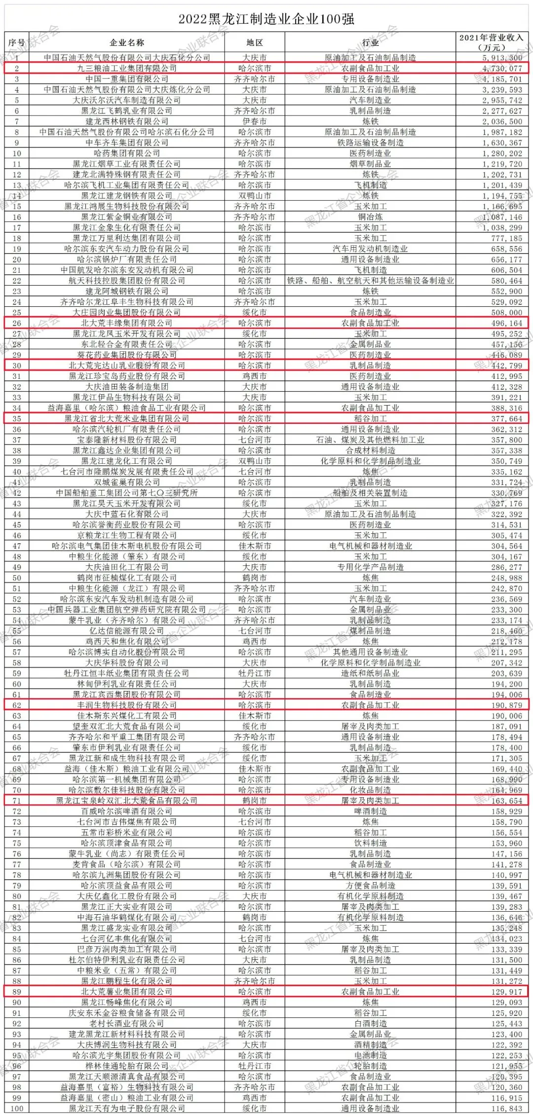 2022年,黑龙江省企业联合会在中国企业联合会的指导下,经企业申报、市地、行业推荐、大数据分析,并征求政府相关部门和有关行业协会、商会意见,专家审定,并经社会公示,依照国际通行的企业排序规则和中国企业500强评价体系,以企业营业收入为入围标准,连续17年推出黑龙江企业100强,连续6年推出黑龙江制造业企业100强和黑龙江服务业企业100强,连续4年推出黑龙江民营企业100强,联合省玉米行业协会首次推出黑龙江玉米深加工企业10强,并开展了相应的分析研究工作。