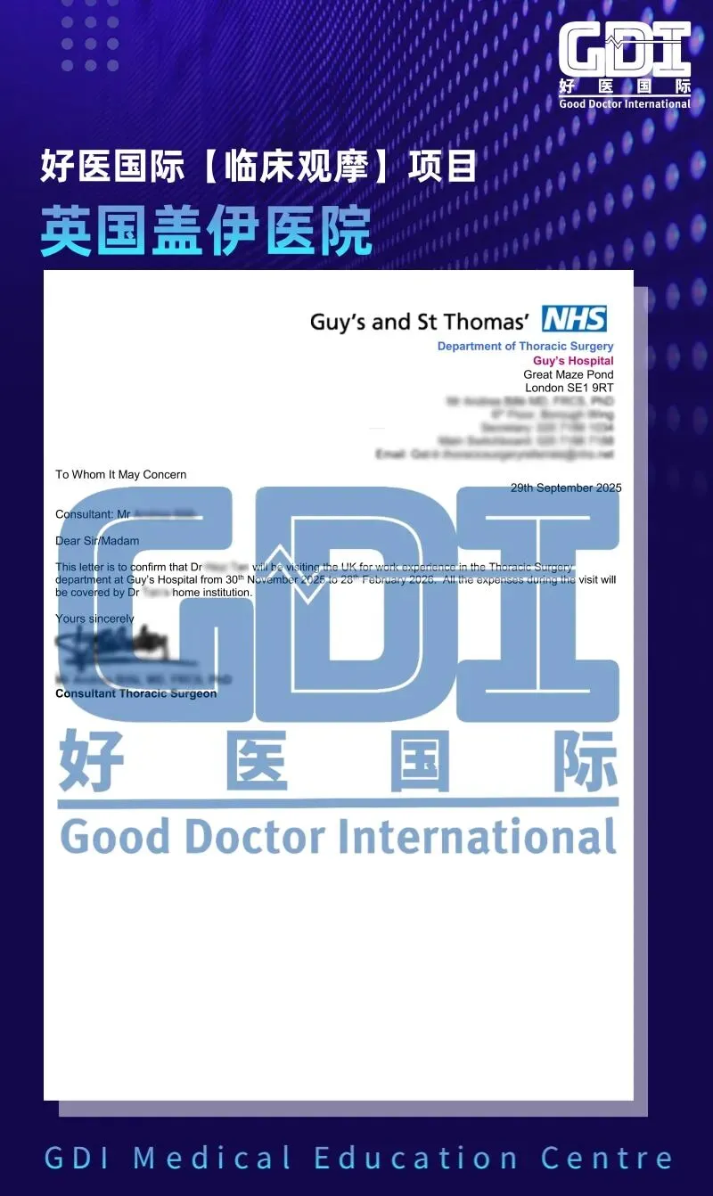 参与本项目,Dr.Y希望能在胸外科疾病方向进一步进行深度学习。英国盖伊和圣托马斯医院健康基金信托作为英国排名第一的NHS信托,一直以来都是好医国际的友好合作单位。盖伊医院作为英国盖伊和圣托马斯健康基金信托的核心成员,这也自然成为了好医国际为Dr.Y海外研修项目首要推荐的机构。经过内部推荐及多轮沟通,盖伊医院胸外科的临床教授Prof.A接收了Dr.Y,并发来了邀请函。