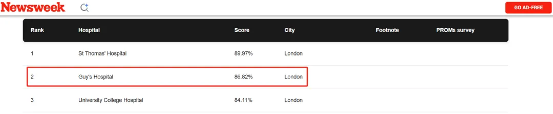 盖伊医院(Guy's Hospital)拥有世界领先的专科集群,在癌症、心脏与肺部疾病以及肾脏服务等多个专科领域都享有盛誉,且多个领域被公认为英国国家级卓越中心,并以其在医疗体系中的关键角色持续引领行业。根据最新的《新闻周刊》(Newsweek)2025年“全球最佳医院”榜单可知,该医院目前在全英国排名第2。