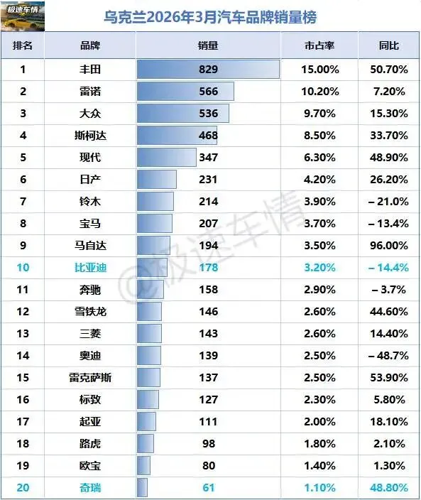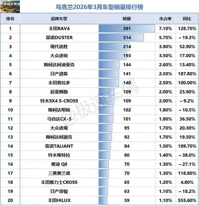 大家好,这里是极速车情。今天为大家带来乌克兰汽车市场2026年3月的销量数据报告。