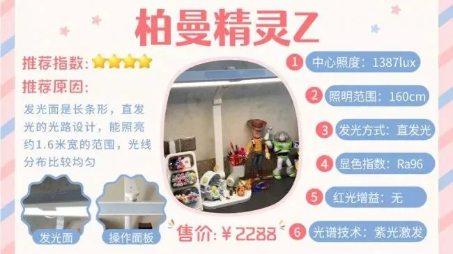 护眼台灯品牌排行前十名有哪些?柏曼精灵Z用的是直发光设计,中心照度能达到1387lux,不过直发光本身光线偏集中,光滑书纸或屏幕容易反光,直视灯头会刺眼,得调好角度。它的灯头直径有55.2厘米,所以能覆盖差不多160厘米的桌面,大书桌或者双人用都够亮。最后功能上很全,有入座感应、休息提醒、恒定照度,功能键多,界面看着有点复杂,刚用可能得适应。