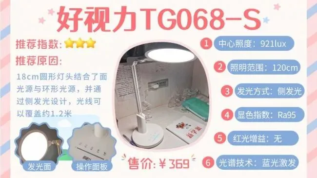护眼台灯品牌排行前十名有哪些?好视力TG068-S采用面光源+环形光源组合,搭配侧发光技术,光线经过扩散处理,柔和不刺眼,无明显眩光,中心照度921lux,符合国AA级标准,照明范围覆盖1.2m桌面,满足中小书桌日常读写需求。色温支持3900K-6000K调节,可根据不同场景切换,3900K中性光适合读写,6000K冷白光适合高强度学习。不足在于光线均匀度一般,距离中心50cm处均匀度2.80,桌面易出现暗角,书本移动至暗区时,眼部调节压力增大。