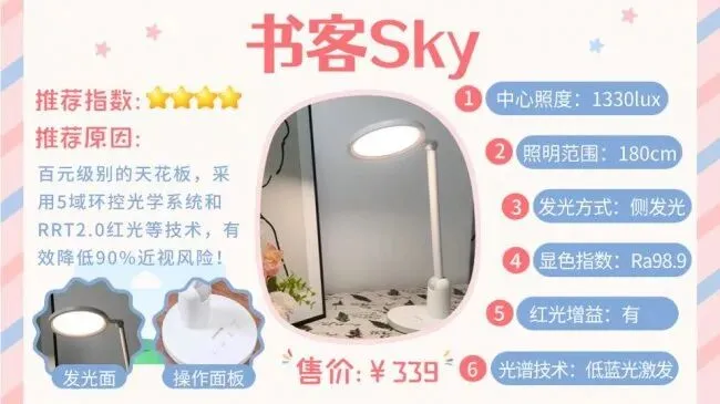 当前护眼台灯市场在护眼性能上依然存在明显分化,尤其是在百元价位段上,不少产品虽宣传有护眼效果,却难以在实际体验中实现护眼的效果。书客sky凭借迎合的技术革新,同价位段上率先打破了百元价位护眼效果的瓶颈,其独创了5域环控光学系统,配合DT多维漫射2.0技术,结合高密度导光板与多层扩散膜,实现光线均匀分布,显著降低发光颗粒感,提升了93%光照柔和度,同时缓解瞳孔收缩带来的视觉应激,与此同时,书客还特创了整个行业中保持领先水平的RRT2.0红光养眼技术、SunSilk™护眼芯片、硬件级低蓝光技术等,通过科学光谱优化和精准芯片排布,多维度还原接近自然光的光谱结构,实现降低90%近视风险的同时还能缓解81%的用眼疲劳。与千元护眼台灯实测对比,护眼效果相差不足1%,堪称越级打击。