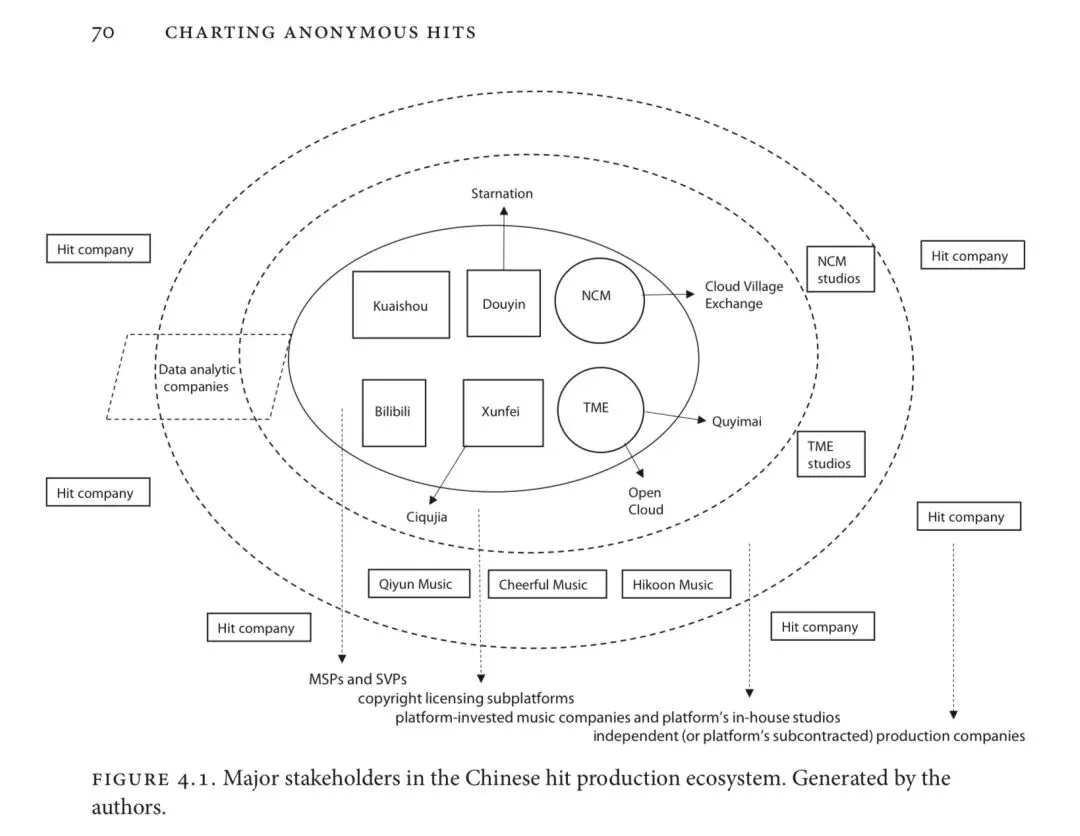 在这一平台生态体系中,诸如抖音以及网易云音乐等平台,不仅推出了用于内容授权的子平台(subplatforms),例如Quyimai与Starnation,还通过投资方式布局版权公司,如Hikoon Music与Qiyun Music。这些版权公司再与外包的爆款制作机构(subcontracted hit-making firms)合作,通过收购或买断新发行作品的出版版权,从而在产业链上游实现控制。与此同时,音乐流媒体平台也建立了内部制作工作室(in-house production studios),专门用于打造潜在爆款或挖掘新兴的病毒式歌曲(viral tracks),并通过同时掌握出版版权与录音版权来强化后续推广能力。