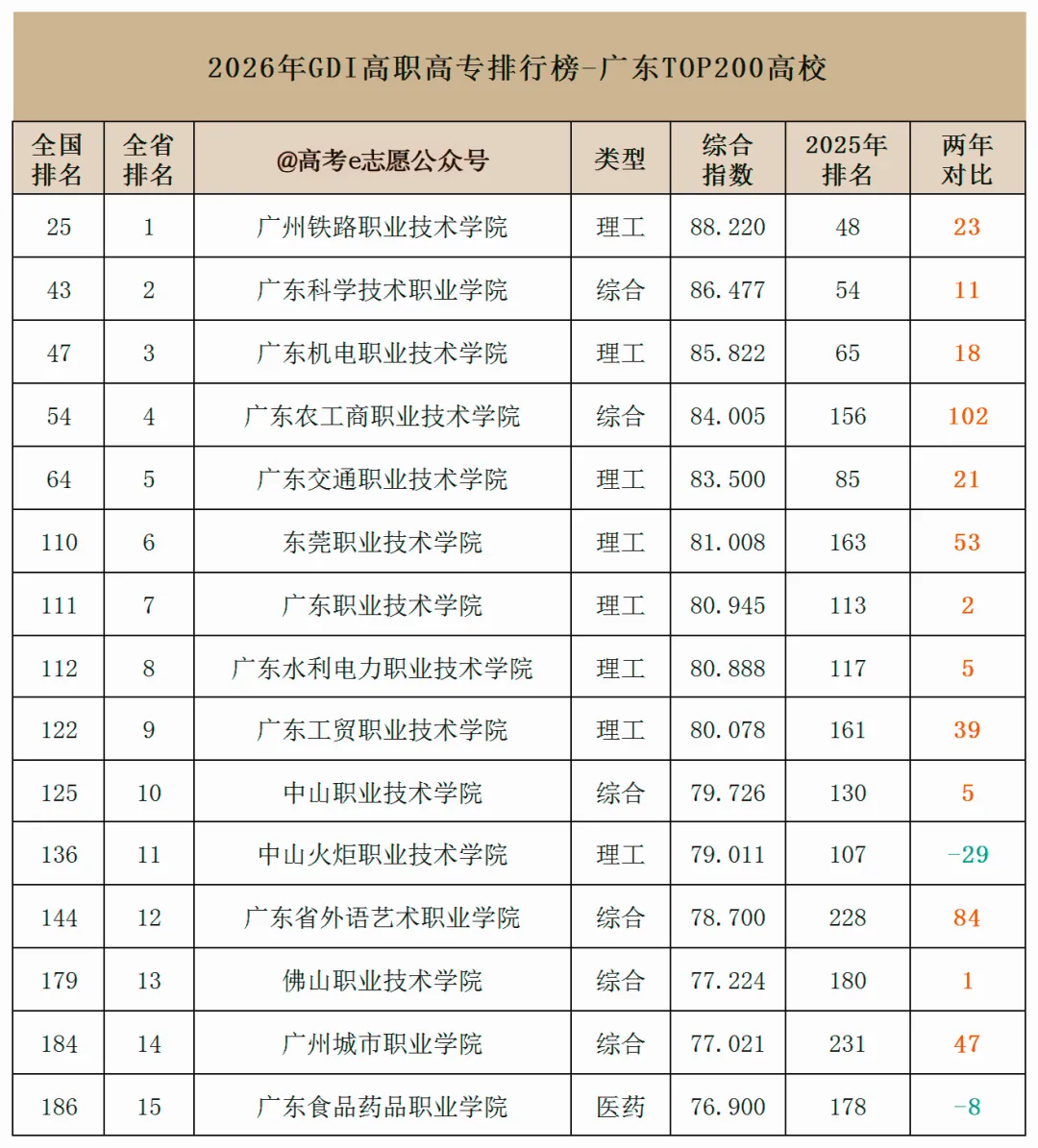 理工院校占据全省前10中的7席,延续了绝对主导地位,契合广东制造业、交通、电力等支柱产业的人才需求,同时东莞职业技术学院、广东省外语艺术职业学院、广州城市职业学院等院校也实现了20名以上的大幅上涨。点此免费测你的分数能报哪些大学+专业,专科、本科都适用