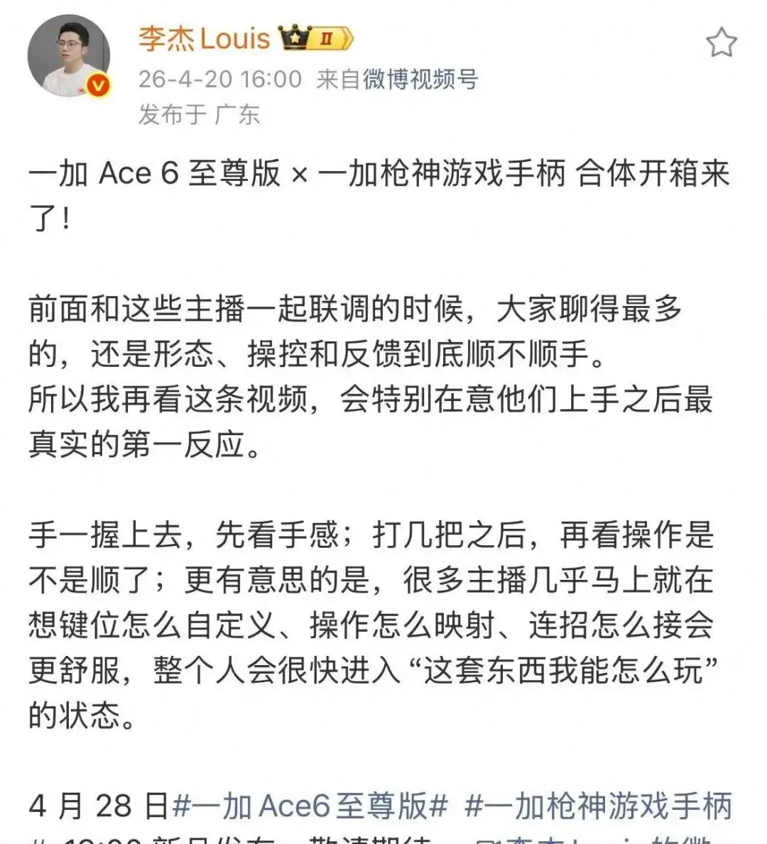 最近一加的总裁李杰在微博上发了个挺有意思的帖子,说他们和一加 Ace 6 至尊版一起配套推出的游戏手柄——一加枪神手柄,已经跟一些主播们一起做了联调测试。最让他在意的是,这些主播拿到手柄之后的真实反应。