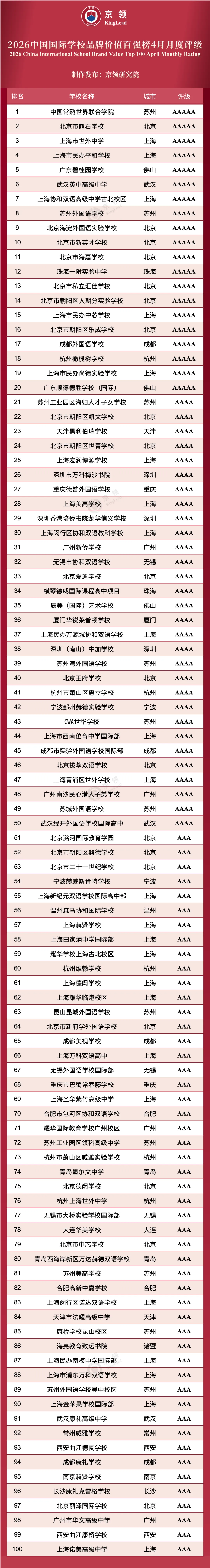京领2026中国国际学校品牌价值百强榜4月月度评级出炉!