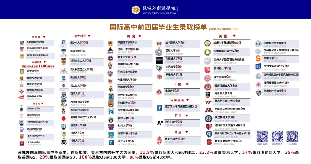 苏城外国际高中始终以“深耕香港和新加坡方向升学”为特色,凭借独一无二的A Level进阶班课程体系和资源优势,助力全人学子叩响世界名校,尤其是被称为“亚洲教育高地”的香港、新加坡名校的大门!连续四届毕业生都交出亮眼答卷——