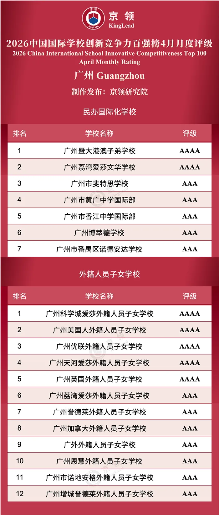 2026年4月,京领发布中国国际学校创新竞争力百强榜4月月度评级,广州地区共有19所国际学校上榜,其中民办国际化学校7所、外籍人员子女学校12所,整体呈现民办校特色多元、外籍校认证完善、区域国际化教育布局均衡的特点。本次评级从认证、师资、社会影响、可持续经营与专家评估五大维度综合评定,广州上榜学校覆盖主流国际课程与特色办学方向,成为华南地区国际化教育创新发展的重要样本。