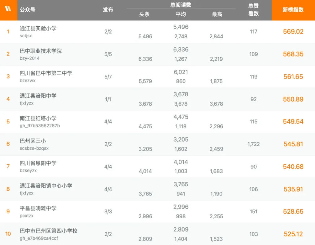 在本周教育类榜单中,“通江县实验小学”以5496次阅读量总数,569.02新榜指数领跑教育类榜单;“巴中职业技术学院”以6336次阅读量总数,568.35新榜指数获得教育类榜单第二名。