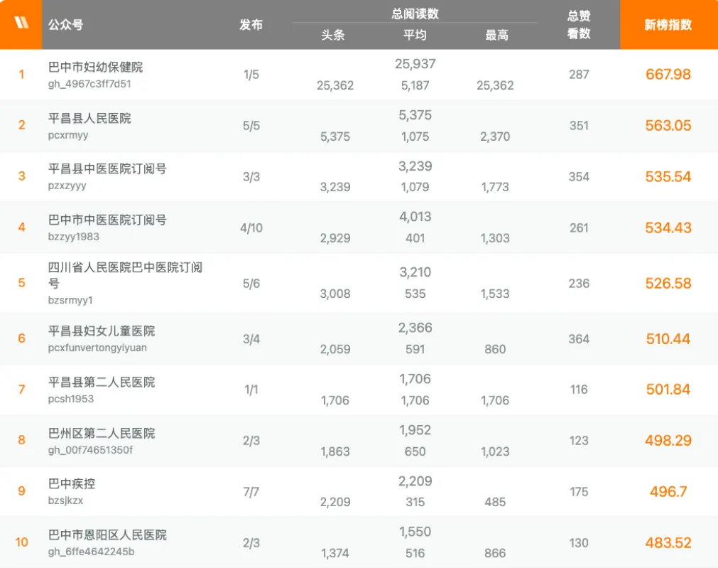 在本周卫生类榜单中,“巴中市妇幼保健院”以25937次阅读量总数,667.98新榜指数领跑卫生类榜单;“平昌县人民医院”以5375阅读量总数,563.05新榜指数获得卫生类榜单第二名。