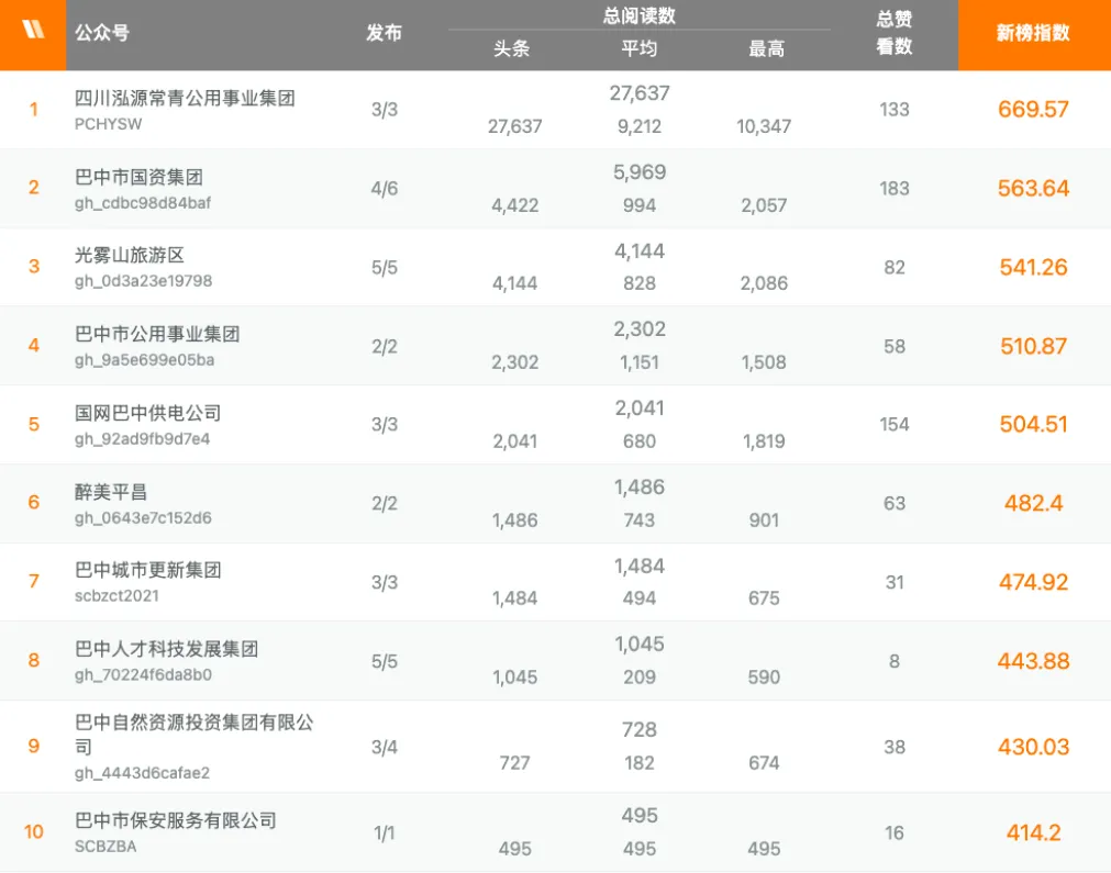 在本周国企类榜单中,“四川泓源常青公用事业集团”以27637次阅读量总数,669.57新榜指数领跑国企类榜单;“巴中市国资集团”以5969次阅读量总数,563.64新榜指数获得国企类榜单第二名。