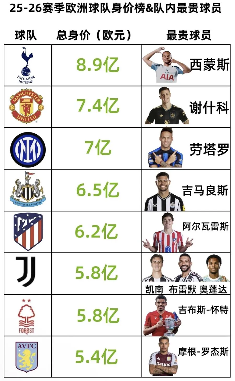 >25-26赛季欧洲球队身价排行榜&队内最贵球员