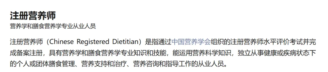是具有营养学和膳食营养学专业知识的从业人员,通过中国营养学会考试并注册,能独立从事健康或疾病状态下的个人或团体膳食管理、营养支持、治疗、咨询和指导工作。