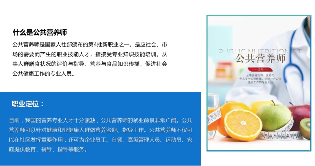 入行门槛相对更宽泛。通过系统的培训学习,掌握营养学基础、膳食指导、营养教育等知识和技能后,即可考取相应证书。这是投身健康传播、营养教育、等相关行业的良好起点。