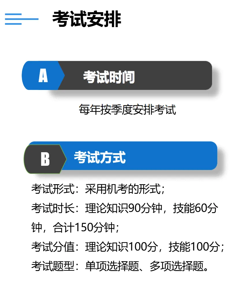 理论考试+操作技能考试,实行百分制,各项成绩皆达60分(含)以上者为合格。