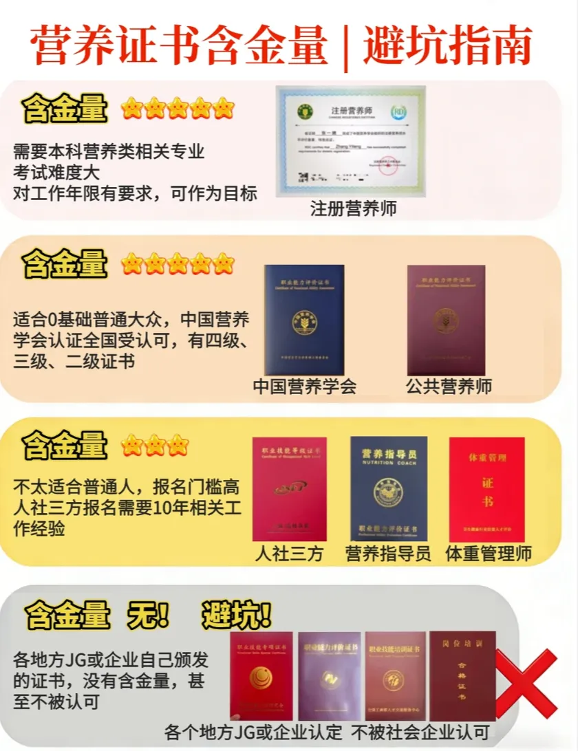 总之:这个证书最适合咱们普通人,难度适中、认可度高。考了这个证书后,未来可以升级营养师二级和注册营养师!