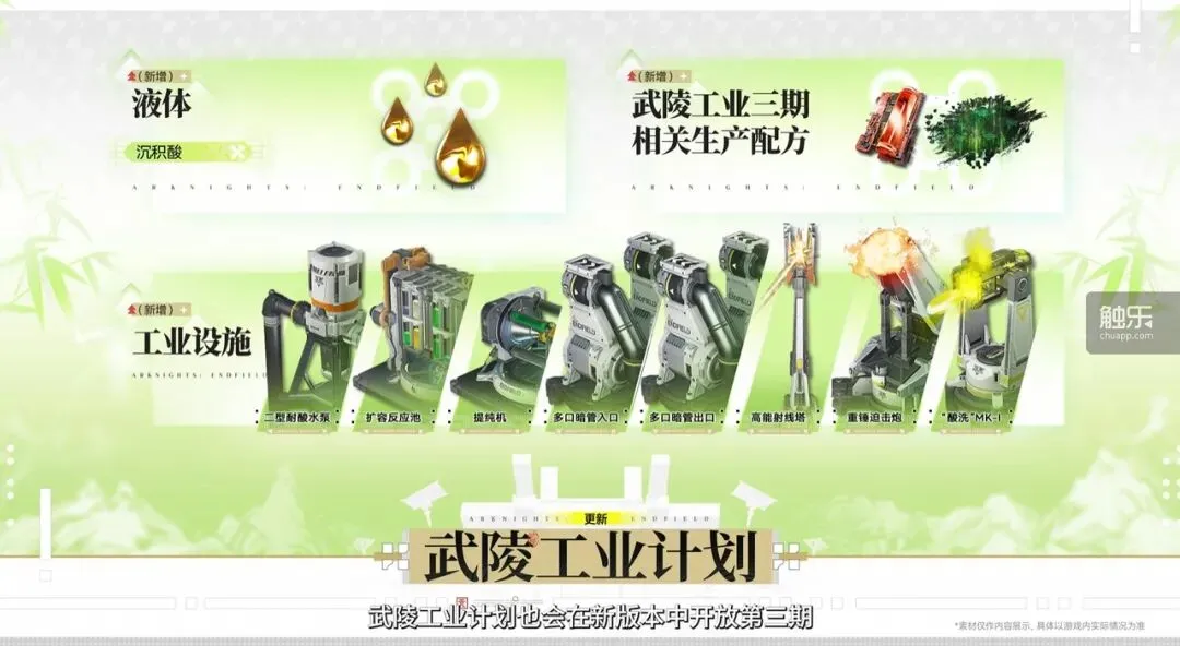 “春晓时”里,武陵工业迈入了第三期,规模继续扩大,材质处理逻辑上也有所升级。围绕着新资源“沉积酸”,游戏增加了二型耐酸水泵、扩容反应池、提纯机、“酸洗”MK-I等一系列设备。玩家可利用的空间进一步延伸,扩容反应池与提纯机的功能升级也需要玩家调整规划,采用更合理的安排。