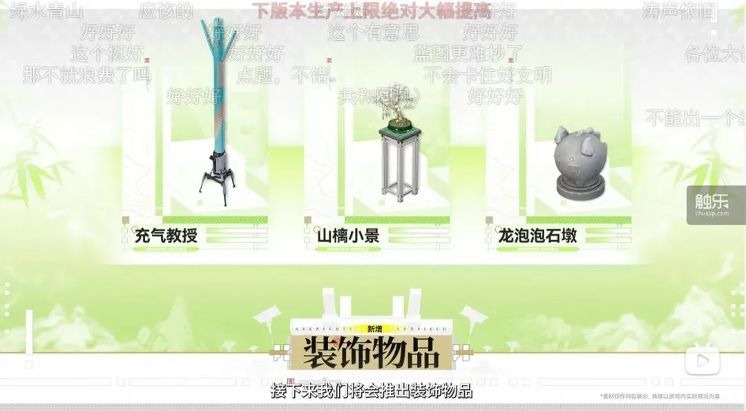 值得一提的是,除了素材、装备、塔防设施等“正经”工业化产物,新版本还加入了装饰物品,目前开放了充气教授、山樆小景和龙泡泡石墩等3款产品。坦白地说,和那些复杂的流水线相比,我反而对这些看似“无用”的东西更感兴趣——从实际反馈来看,不少玩家应该也是这样想的。在版本前瞻直播的评论区里,已经有人打算在武陵城街道上放满石墩子来挡住洒水车路线。而这套系统未来的潜力也是显而易见的:也许某一天,当装饰物足够多、足够有趣时,我们真的能装扮出一个富有个人风格的武陵城?