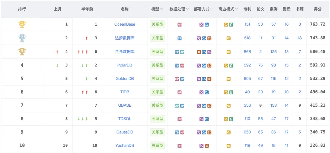 本月榜单前十竞争格局迎来显著变化,头部座次重新洗牌。OceanBase与达梦数据库排名差距同比上个月在缩小,与金仓国产数据库共同组成全新前三甲。厂商凭借持续的技术投入、成熟的行业方案与广泛的市场认可,持续领跑国产数据库赛道,也进一步推动行业向更高性能、更安全可靠、更全面生态的方向加速演进。接下来就和小编一同盘点下国产数据库榜单前十部分表现。
