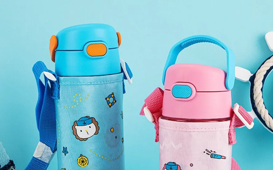 搭配同系列卡通杯套,杯套做了加厚处理,可起到缓冲作用,同时方便孩子抓握,背带可调节,出行背负更舒适。