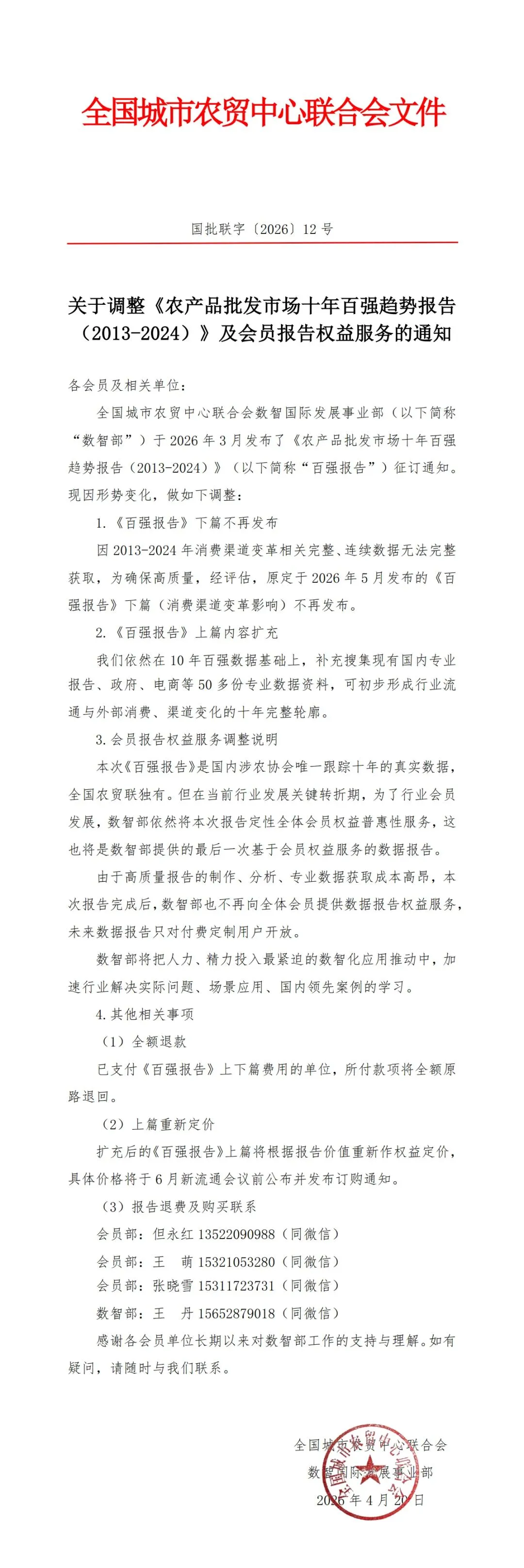全国城市农贸中心联合会数智国际发展事业部(以下简称“数智部”)于2026年3月发布了《农产品批发市场十年百强趋势报告(2013-2024)》(以下简称“百强报告”)征订通知。现因形势变化,做如下调整: