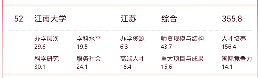 在备受关注的主榜(综合性大学排名)中,江南大学位列全国第52名;