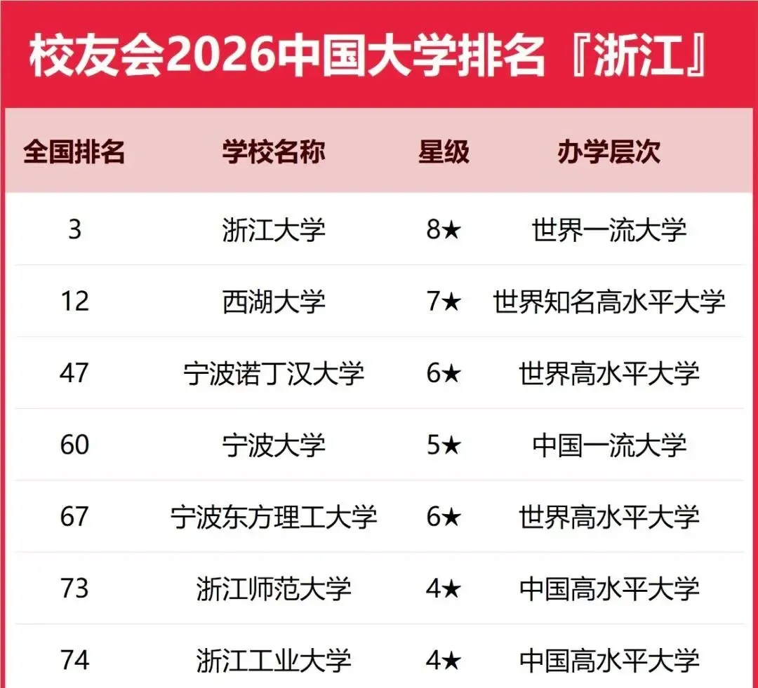 2026年校友会中国大学排名的最新结果已经公布。这份榜单显示,浙江省高等教育呈现出强劲的整体实力。一个突出的标志是,该省共有7所高校成功进入了全国前100名的行列。在这份引人注目的名单中,浙江大学、宁波大学、浙江师范大学和浙江工业大学的排名情况,为我们深入了解浙江高教的格局提供了具体坐标。