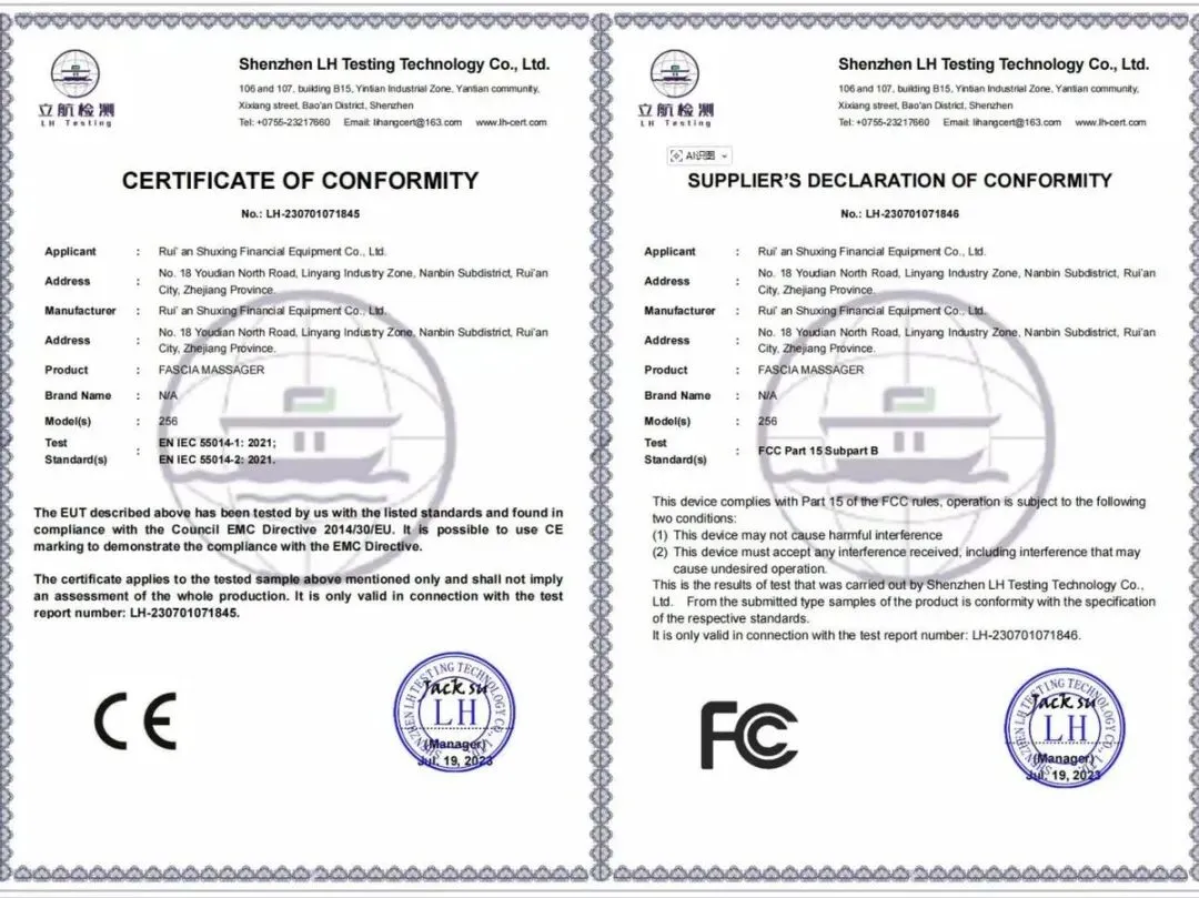 值得重点强调的是,鲸帝筋膜枪拥有专属外观设计专利号:ZL 2020 3 0504704.9,以原创设计理念打破市场同质化僵局,彰显了品牌的研发实力与创新精神。同时,产品顺利通过CE-EMC 证书和FCC 证书双重国际认证,严格遵循国际安全标准,电磁兼容性优良,品质历经全球市场的检验,让消费者能够放心选购、安心使用。