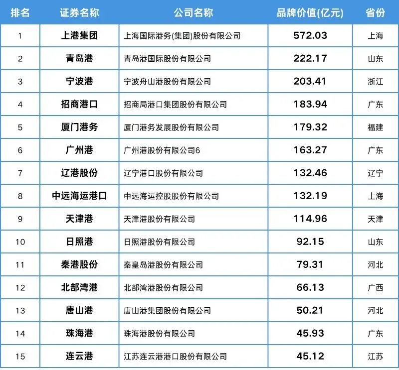《中国港口上市公司品牌价值排行榜》前15名如下: