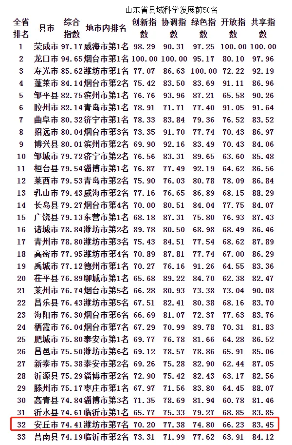 2018年安丘市位于山东省县域科学发展第32位,潍坊第7位