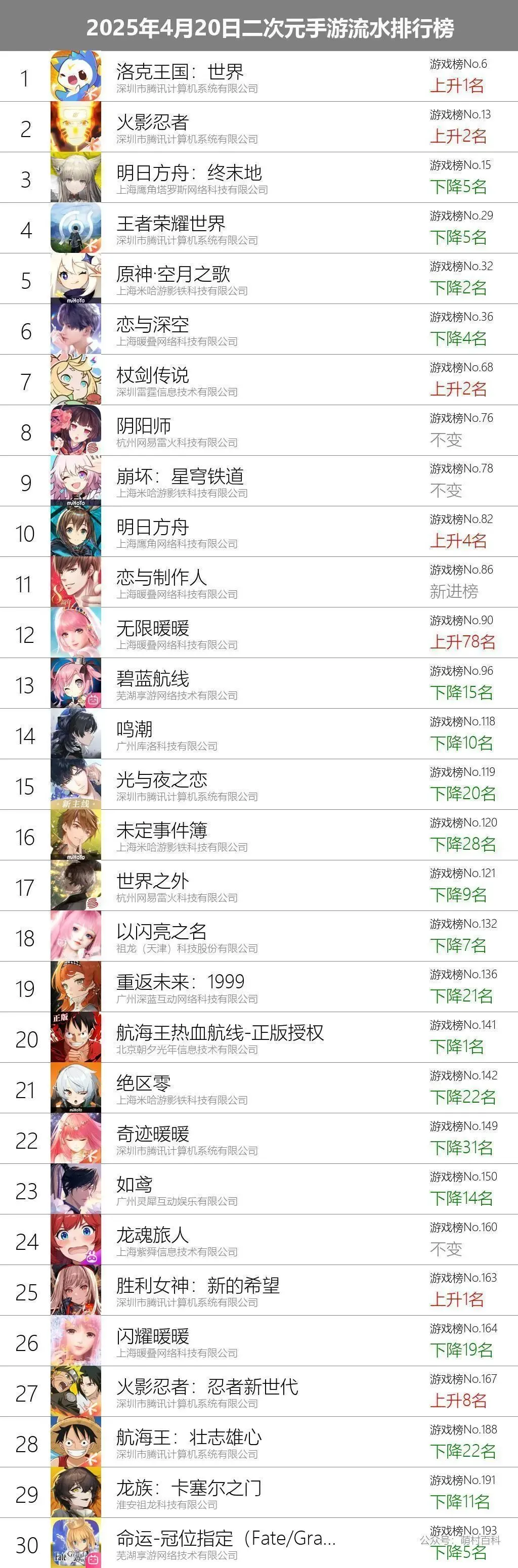 4月20日二次元手游流水排名榜单(文字版)