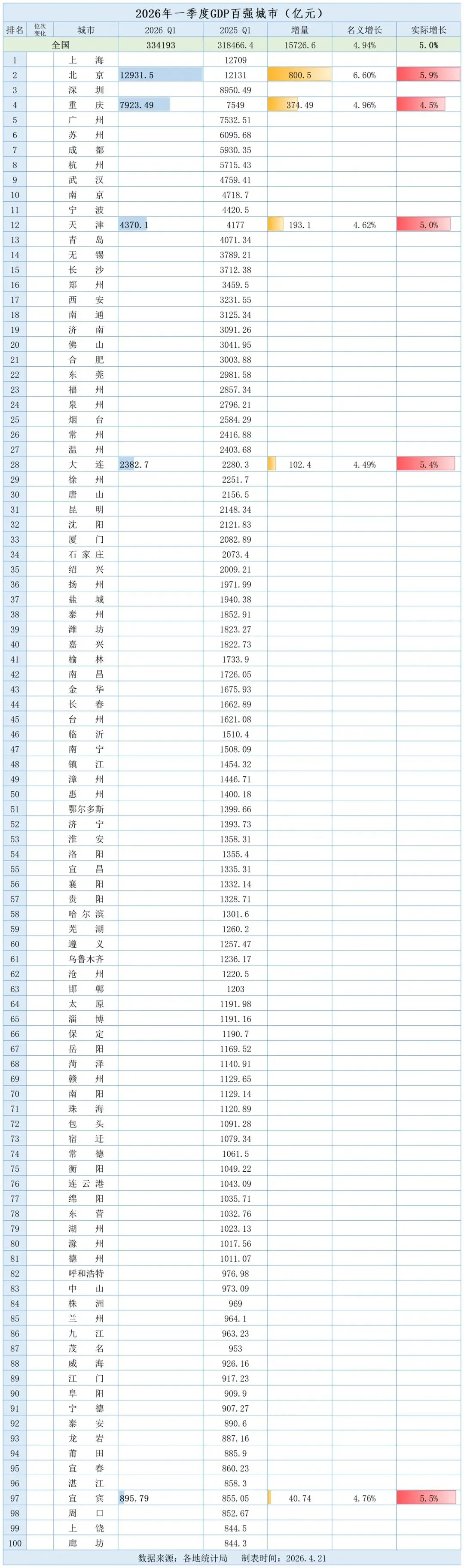 >2026年一季度GDP百强城市更新中:大连出炉