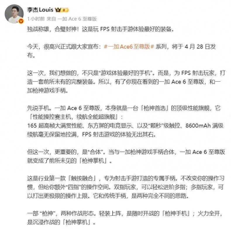 4月20日一加官宣Ace 6至尊版与枪神手柄组合,瞄准FPS射击手游打造专属装备体系。在我看来,这不是简单的硬件升级,而是手游电竞硬件赛道的一次规则重构,它真的能解决玩家的核心痛点吗?