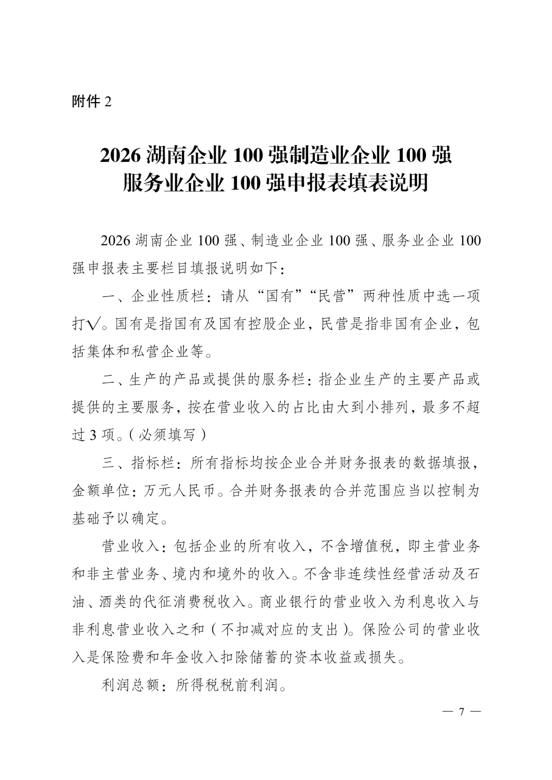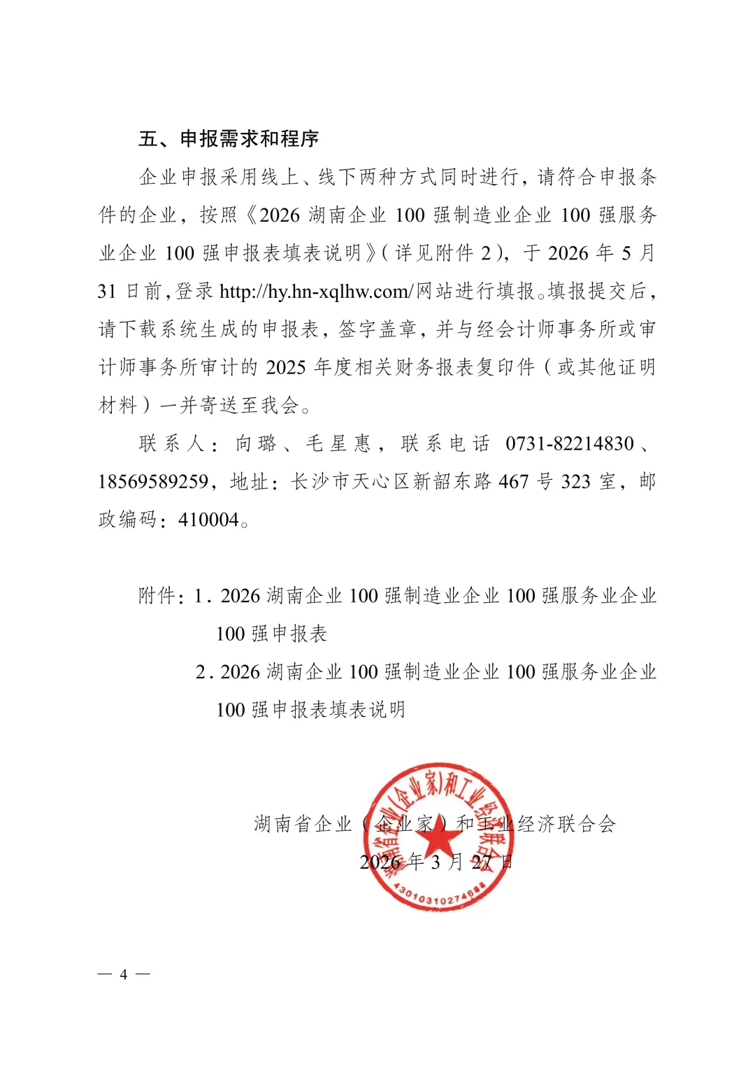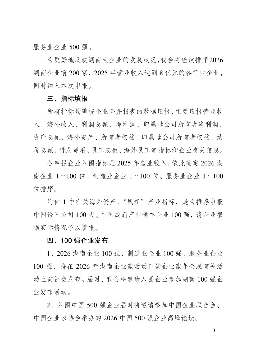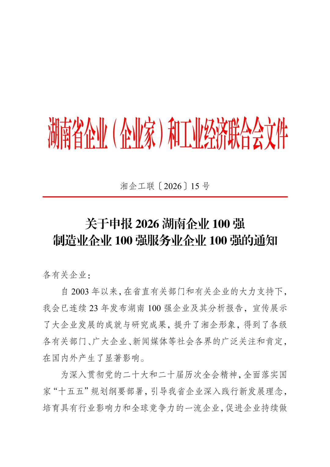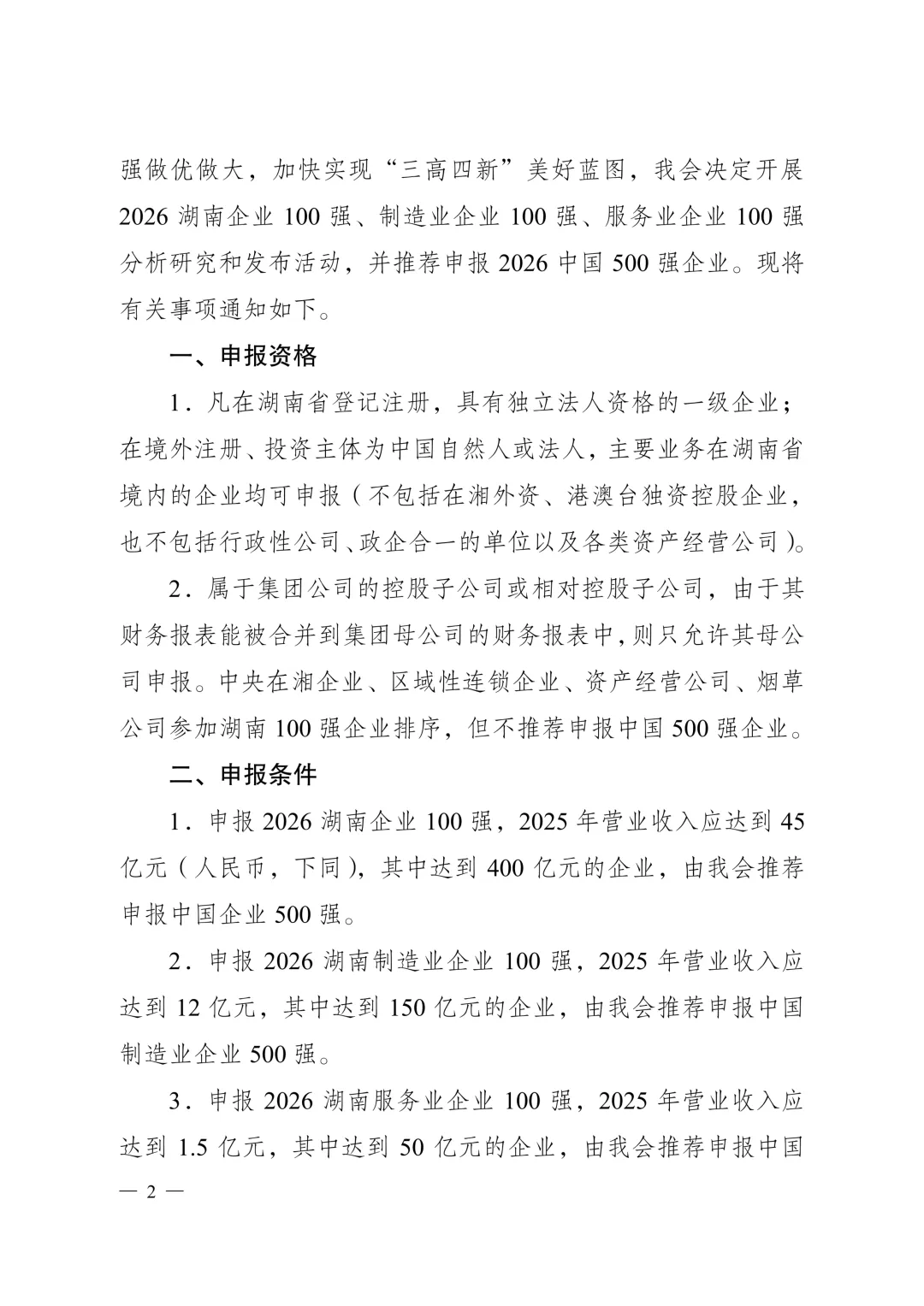 >转发 | 关于申报2026湖南企业100强制造业企业100强服务业企业的通知