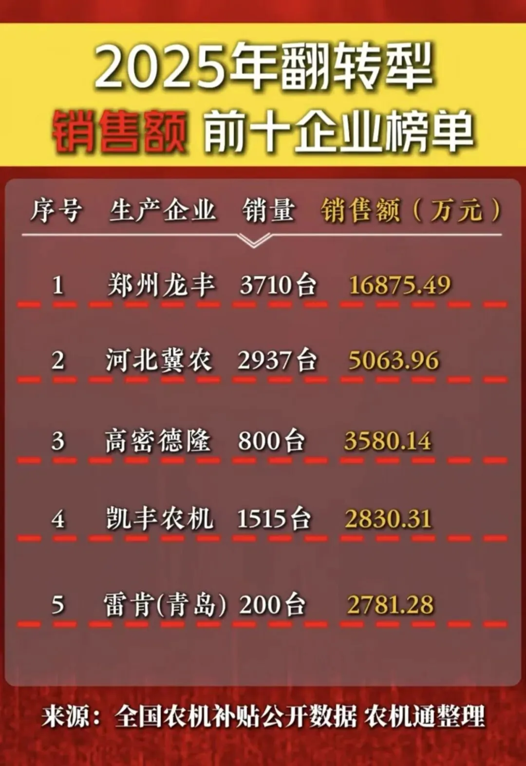 销售额一骑绝尘。依据2025年全国农机购置补贴公开数据整理,龙丰年销售额达16875.49万元,是第二名的3.3倍,是第三名的4.7倍。即便将排名前五的其他四个品牌全部叠加计算,仍难以望其项背。在农机这个利润摊薄的传统行业,龙丰不仅卖得多,更卖得最“值钱”。