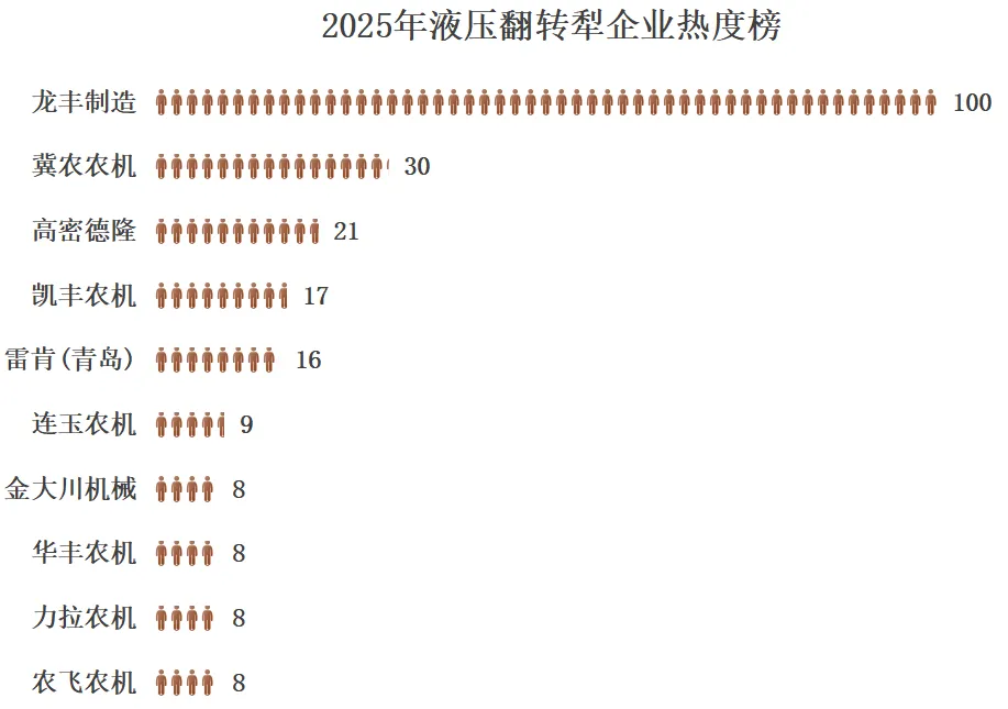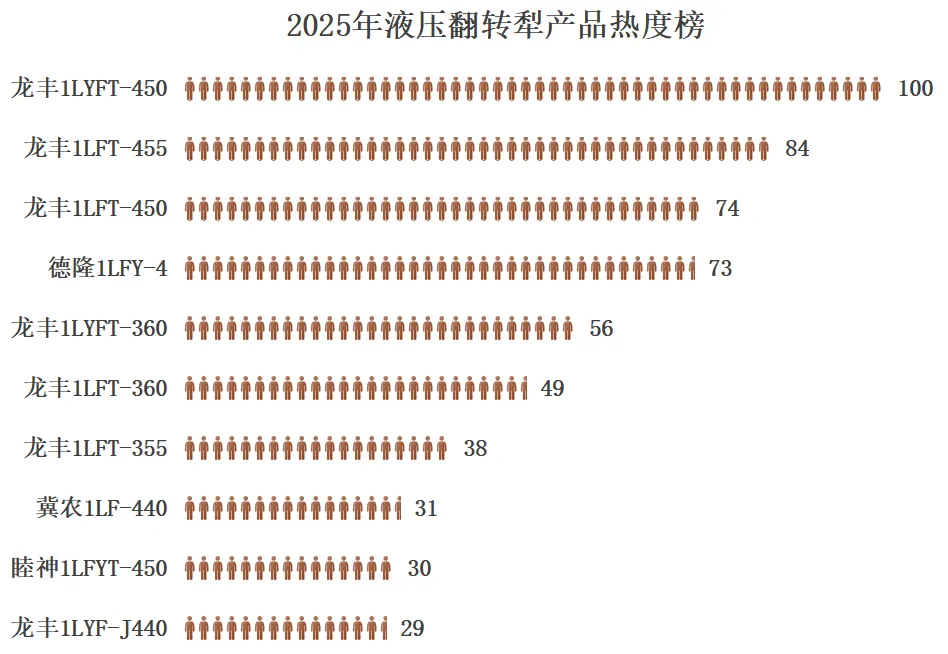 产品霸榜前三。更令行业侧目的是,2025年液压翻转犁产品热度榜的前三名全部来自龙丰:龙丰1LYFT-450液压翻转犁(热度值100)、龙丰1LFT-455液压翻转犁(热度值84)、龙丰1LFT-450液压翻转犁(热度值74)。单一企业同时占据热销产品前三,这在农机细分领域极为罕见。