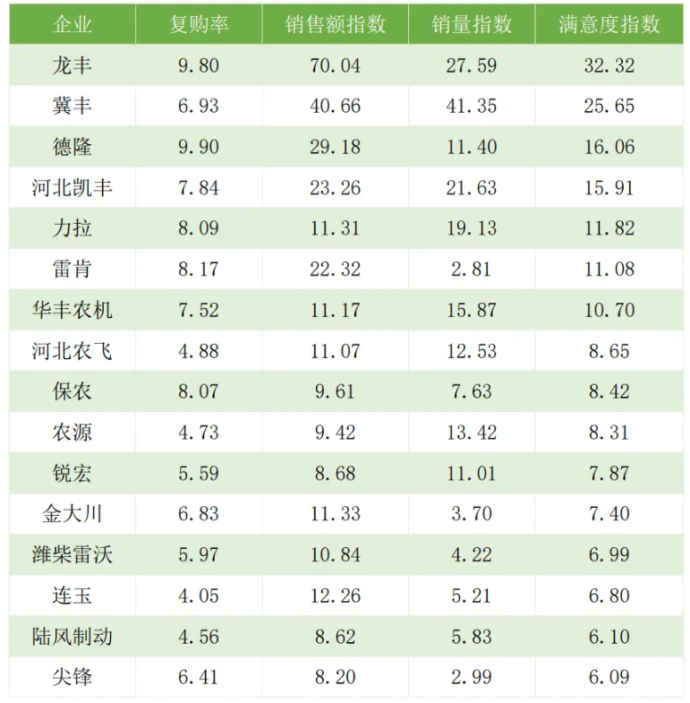 综合指数全方位领跑。 企业综合数据统计显示,龙丰在犁产品领域的销售额指数达70.04、满意度指数32.32,双双位居行业第一,复购率9.80同样处于领先水平。满意度与复购率的高企,意味着龙丰的产品不仅卖得好,更经得起长期使用的考验,口碑效应持续为增长赋能。