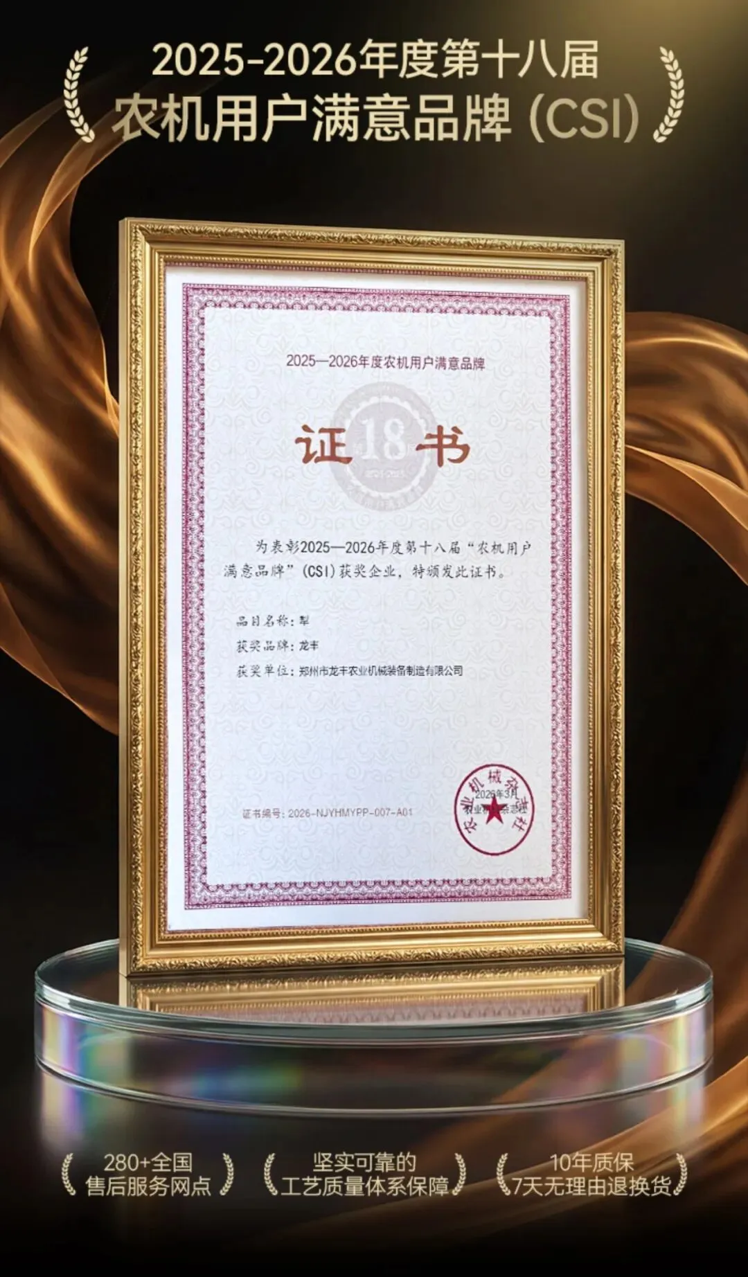 荣誉见证实力。凭借多年在产品质量、用户服务等方面的深耕,龙丰荣获包括第18届在内的多届农机用户满意品牌称号,这一行业权威认证,正是其长期主义的最佳注脚。