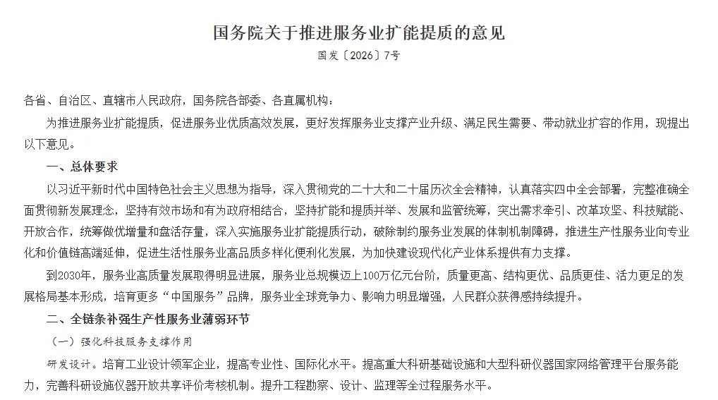 意见提出,到2030年,我国服务业高质量发展取得明显进展,服务业总规模迈上100万亿元台阶,质量更高、结构更优、品质更佳、活力更足的发展格局基本形成,培育更多“中国服务”品牌,服务业全球竞争力、影响力明显增强,人民群众获得感持续提升。
